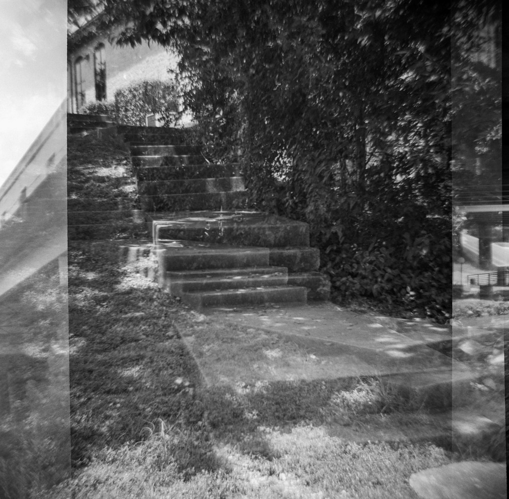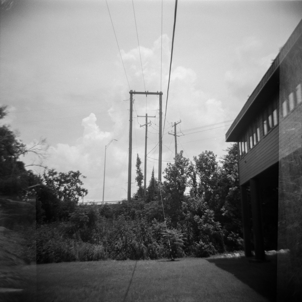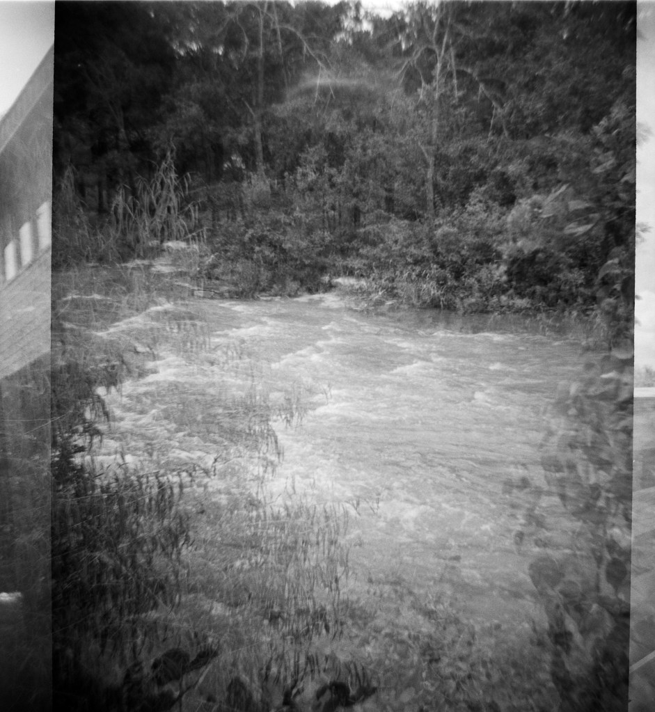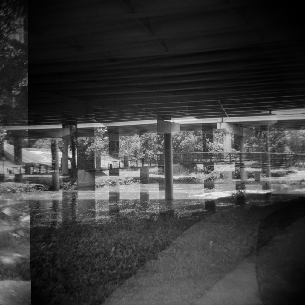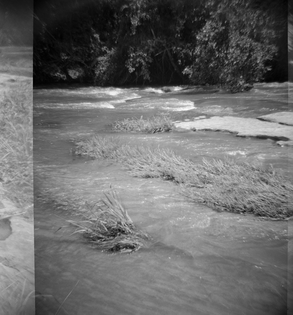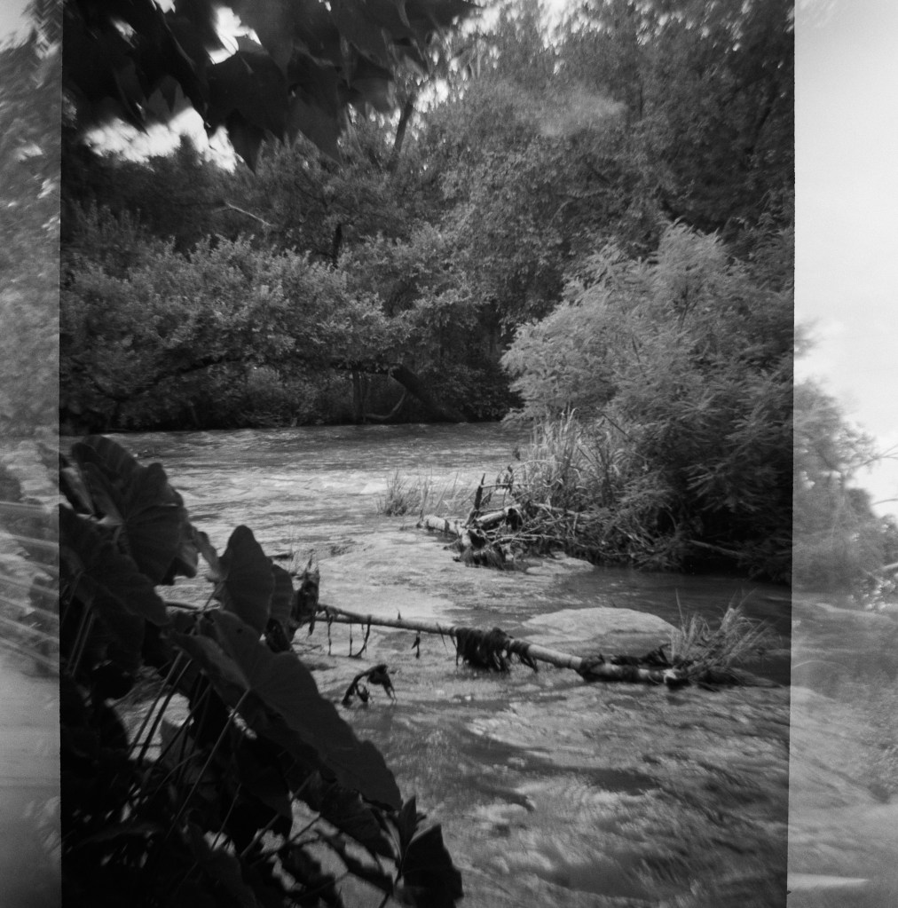 Another reason I chose this part of Brushy Creek for my July roll of film: I love how the plants grow from practically nothing into gorgeous green giants that overwhelm the edges of the path. It’s hot during the summer, but it sure is beautiful to see all of that wonderful growth! Granted I was using b&w film (Kentmere Pan 400) for my Frugal project, but I also took along with me some color film AND a roll of Lomo Purple; neither of those have even made it to the lab yet so y’all will have to doubly wait to see them.